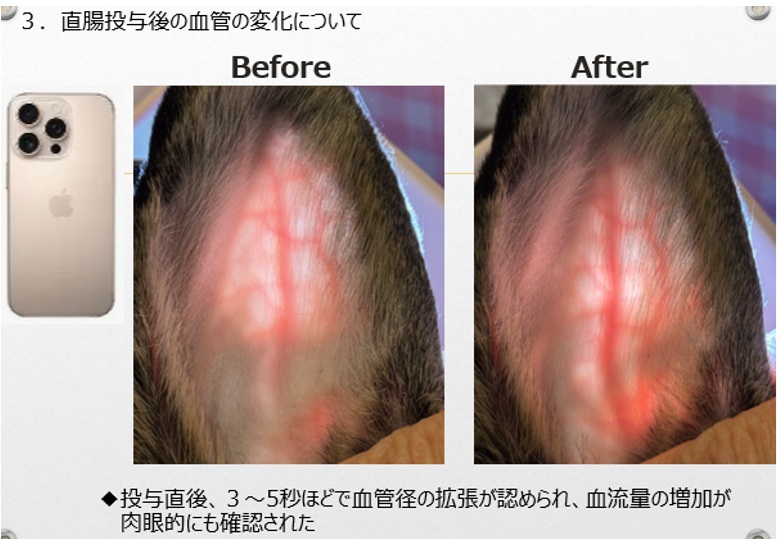 • 投与直後、3〜5秒ほどで血管が太く見え、血のめぐりが増えたと分かる変化が肉眼でも確認できました。