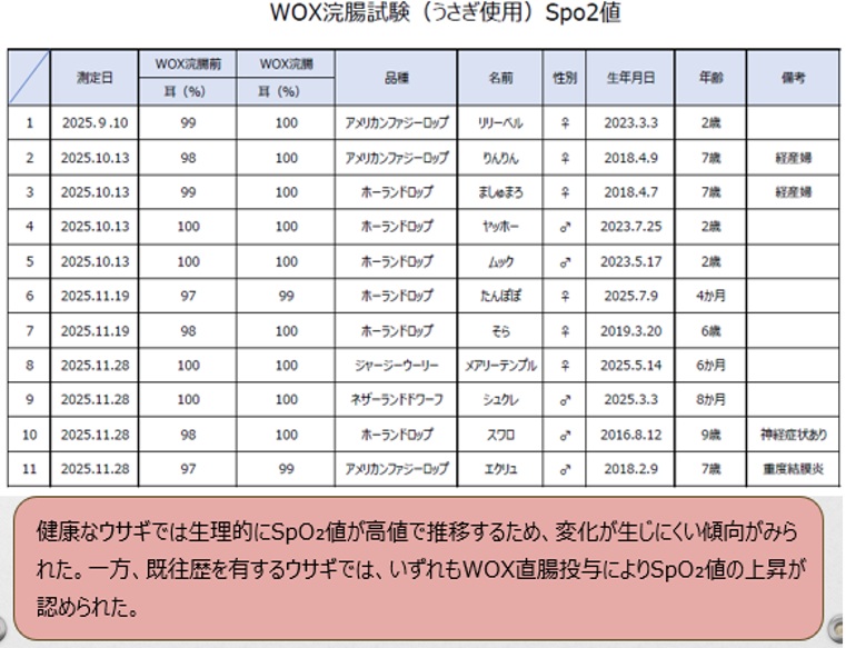 対象は、年齢・性別・健康状態がさまざまなうさぎ11頭。WOX 3mLを直腸へ投与し、投与前後で耳中央部のSpO₂と血管・毛細血管の所見を観察・比較しました。